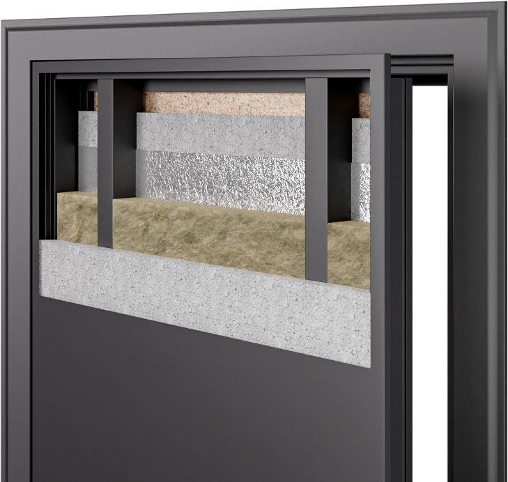 Дверное полотно дверей серии ТЕРМО заполнено минимум тремя слоями изолирующего материала